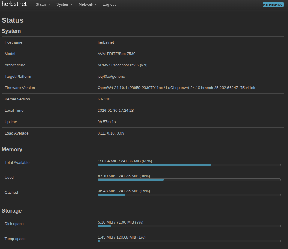 Nach dem ganzen Spass sollte die Weboberfläche LuCI über http://192.168.1.1 erreichbar sein und man kann mit dem ganzen Konfigurationsspass beginnen. Wer nur Router wie die FritzBox oder Speedports kennt wird hier ein ganz neues Level an Konfigurationsüberdruss erleben 😆